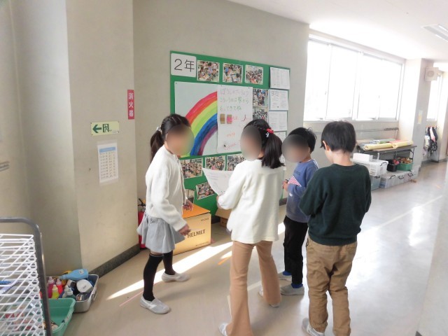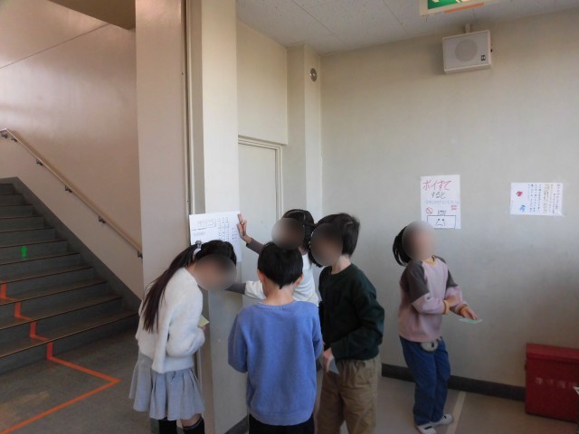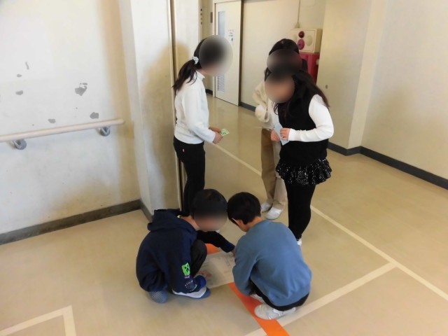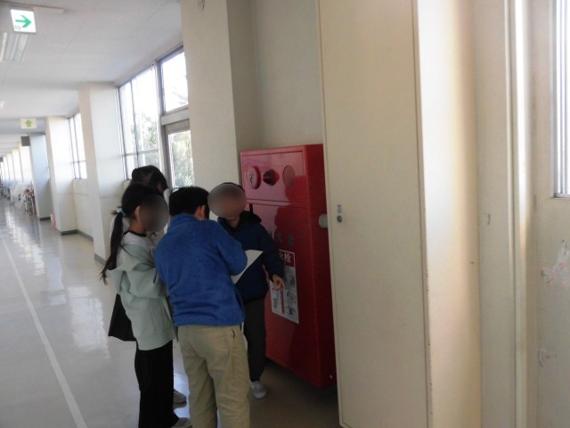 3年生の社会では「火事からまちを守る」の学習をしています。今日は、学校の中の消防施設について調べました。校内を歩き、消火器・消火栓・煙感知器・熱感知器・防火シャッターが校内のどこに設置されているのか探し、校内地図にシールを貼ったり印をつけました。廊下や教室などを隅々まで見てまわり、「消火器がこんなところにあるんだ!」「ここにも熱感知器がある!」と、校内にはたくさんの防災施設があることに気づきました。毎日歩いている廊下で新しい発見がたくさんあったようです。