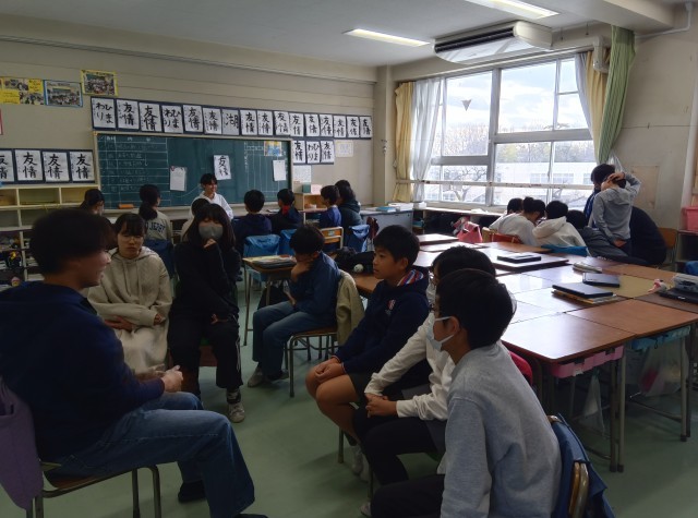 日本大学文理学部のみなさんが、6年生キャリア教育の授業に来てくださいました。小グループに入って、子どもたちの質問に答えていただきました。「なぜ大学に行ったんですか」「大学で何を学んでいますか」「自信をもっていることは何ですか」「今のうちにやっておいた方がいいことはありますか」などたくさんの質問をしていました。大学生のみなさんには「子どもたちから元気をもらった」と言っていただきました。