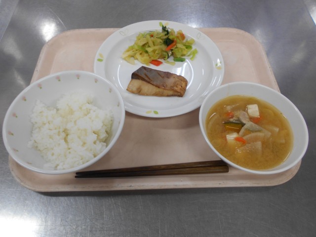【献立】 牛乳 ごはん ぶりのゆず風味焼き 野菜の辛子じょうゆ かぼちゃのみそ汁