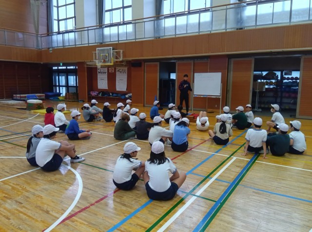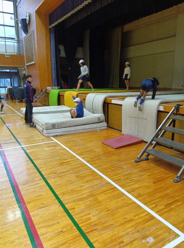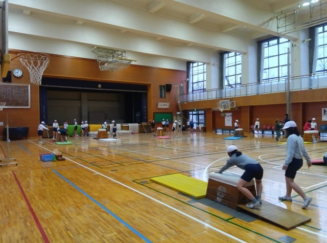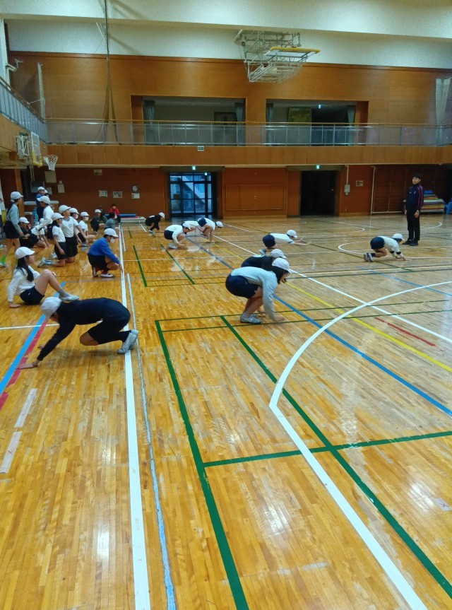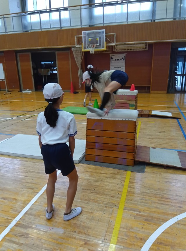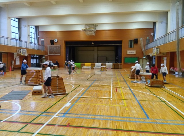 5年生は、体育で跳び箱運動の学習をしています。どの教科も、2学期のまとめに入っています。これまでに学んだことを確認して跳び箱運動のめあては、フワッとするためのコツを見付けよう、です。子どもたちは準備運動の後、開脚跳びやかかえ込み跳び、台上前転、首はね跳びといった技につながる感覚つくり運動をし、自分たちで多くの場の準備をします。さすが高学年!声を掛け合いながら、安全に準備することができています。子どもたちは、空中にフワッと浮く感覚やピタッと着地することなどを意識しながら、運動をしています。