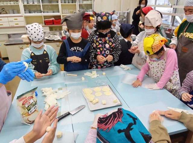 また、他のグループでは、何やら皮を作っているようです。小麦粉をこねて、丸くしています。