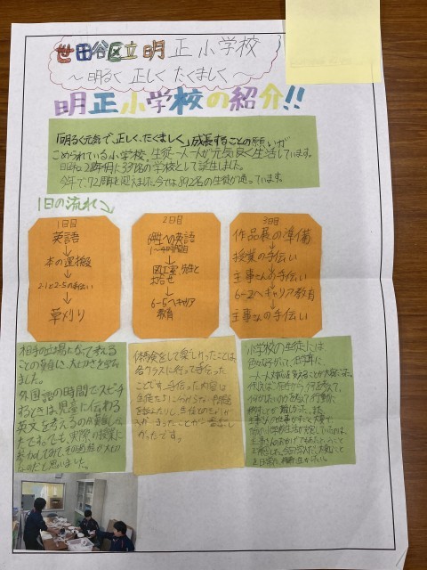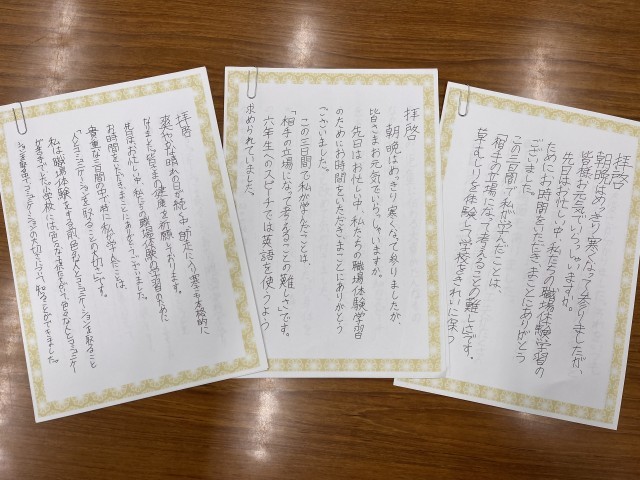 先日、職場体験に来た砧中学校の2年生がお礼の手紙をくれました。小学生だった頃は気付かなかったいろいろな人々が学校を支えていることや「教えること」の難しさなどを感じたと綴ってくれました。季節の挨拶もきちんと書かれていて感心しました。明正小を卒業したのは、ついこの前と思っていましたが、立派になったとうれしくなりました。