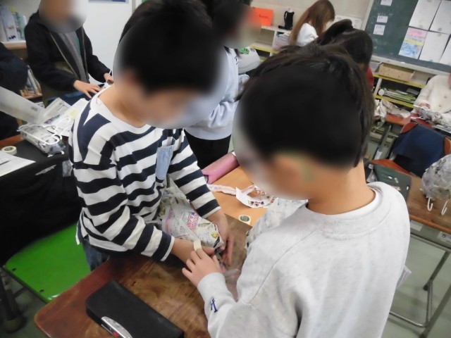 3年生の図工では「ハンガーバード」の制作が始まりました。元気な鳥!かわいい鳥!かっこいい鳥!などなど、色や表情などについてもどんな鳥を作るか考えました。そして、鳥の体を新聞紙を丸めて作り、ハンガーを挟んでテープで止めて、新聞紙で包みます。ハンガーが鳥の足となるようです。バランスよく作るのに苦戦する様子も見られましたが、一生懸命に真剣に取り組むことができました。次は出来上がった本体におはな紙を貼ったり、くちばしや目をつけていきます。どんな鳥たちが誕生するのか楽しみです。