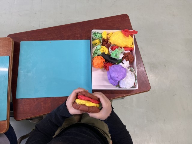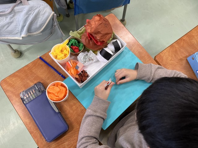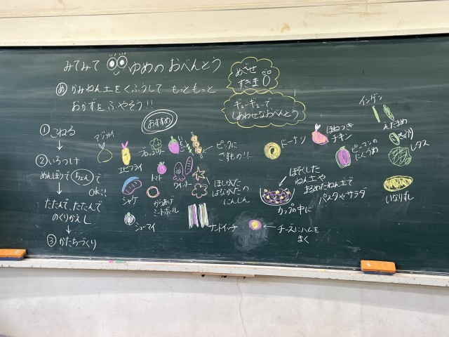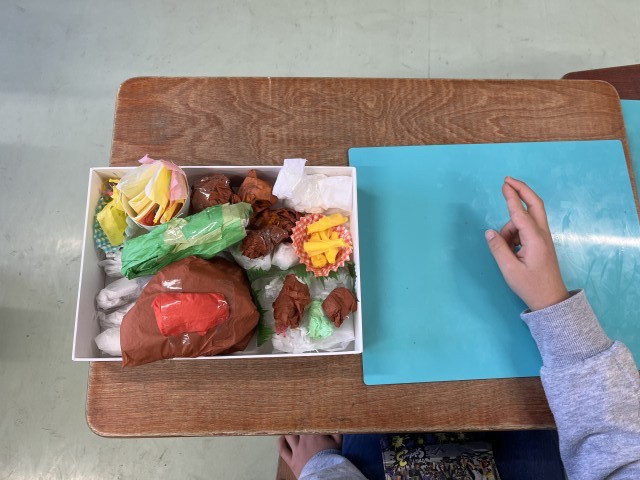 1年生が図工で、「ゆめのおべんとう」を作っています。まず花紙を使って作りました。ハンバーガーや唐揚げ、のり巻きなど、おいしそうなお弁当ができています。これから紙ねんどを使って、さらにおかずを作ります。どんなお弁当になるのか、楽しみです