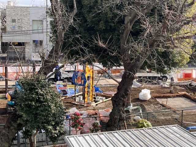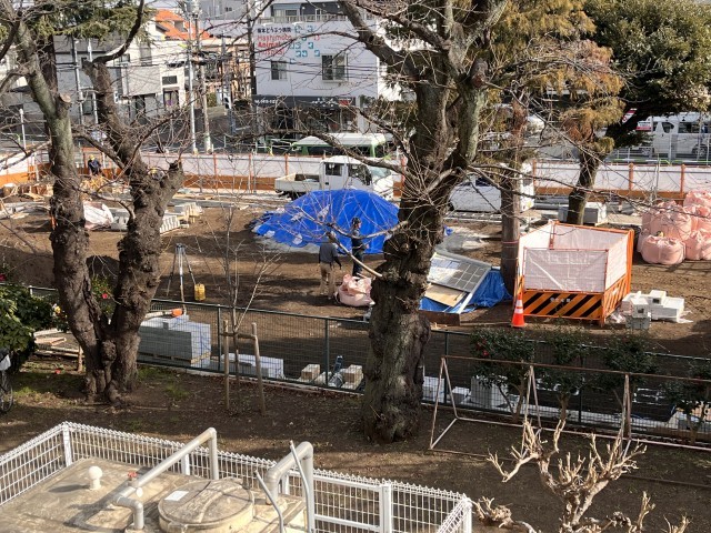 明正公園の工事が進んでいます。学校から覗くと、大きな遊具や、遊具のための土台が見えます。出来上がるのが楽しみですね。