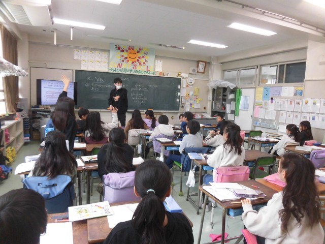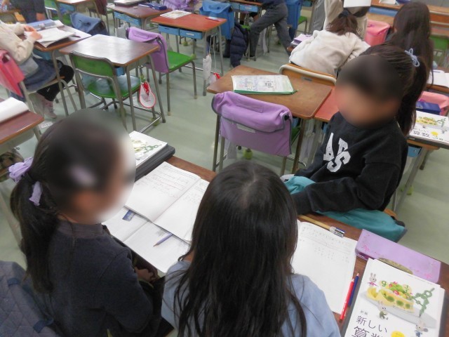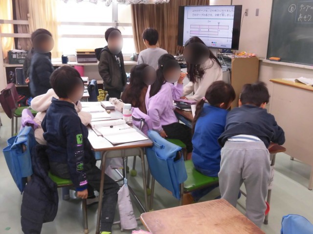 3年生の算数では「分数」の学習をしています。今日は、テープの長さを分数で表すとどのように表すことができるのか考えました。2mのを4つに等分した場合、分数ではどのように表すことができるのかなど、自分の考えをノートにまとめました。友だちどうしで考えを教え合い、発表し、考えを深めることができました。