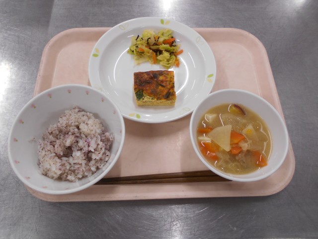 【献立】 牛乳 ゆかりごはん たまご焼き 野菜の塩昆布あえ さつま汁
