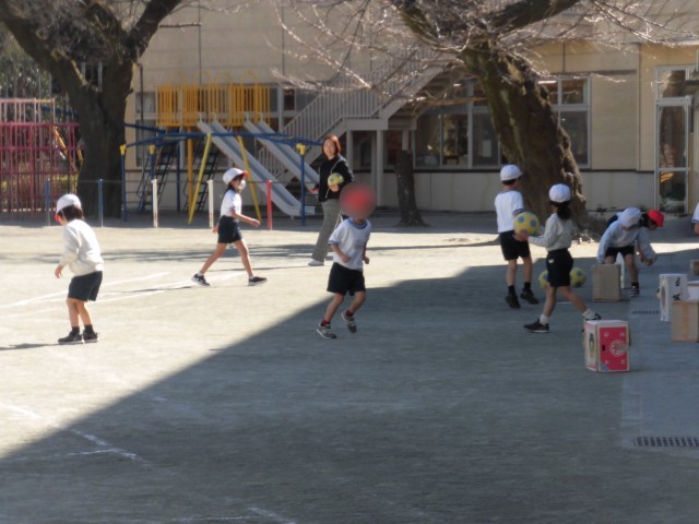 1年生の体育では「ボール蹴りゲーム」の学習をしています。的に向かって、正確にボールを蹴ることができるように、くり返し練習しました。どのように蹴るとまっすぐに蹴ることができるのか、速いボールを蹴ることができるのかなど考えました。「ボールを蹴る」ことと、「ボールを足でとめる」という基本的な動きを身につけていきます。寒い日ですが一生懸命に取り組み、体もポカポカになりました。