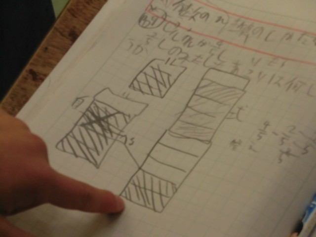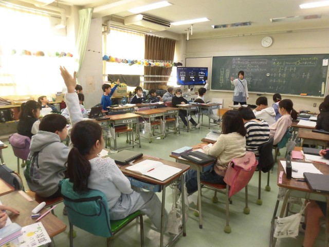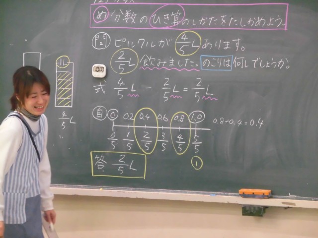 3年生は分数のひき算を学習しました。昨日はたし算を学びましたが、分母が10どうしの計算だったため、小数にして計算する様子が見られました。今日は5分の4から5分の2を引きます。どのように計算するかを各自考えました。5分の4、5分の2を図で表したり、昨日学んだ分子どうしを計算する方法を使ったり、ノートに考えをまとめていました。数直線をかいて小数で表そうする子もいましたが、少し苦戦していたのでそのやり方をみんなで共有し担任がアドバイスをして、問題を解決しました。その後の練習問題では1から分数を引く問題も出されました。多くの子どもが分母をそろえた分数に直してから計算することを理解していました。