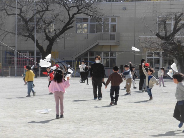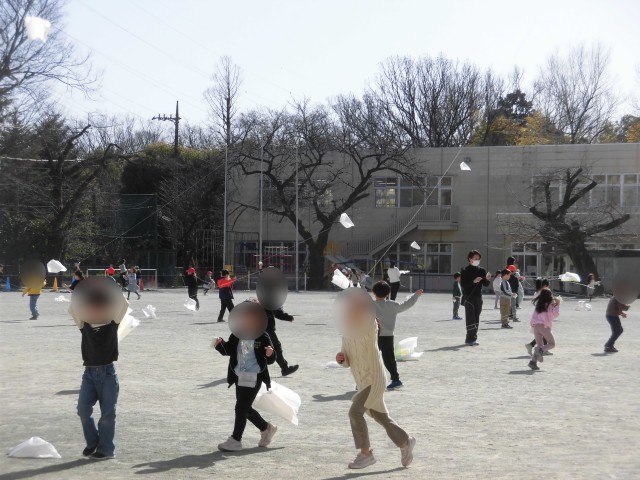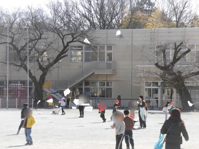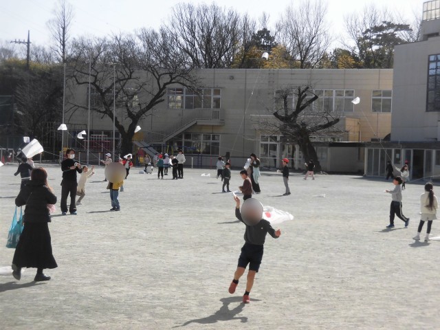 2年生が校庭で「凧あげ遊び」を楽しみました。先週、自分たちで絵を描き、凧ひもをつけてオリジナルの凧を作りました。今日は、校庭で凧あげに挑戦しました。校庭を駆け回り、凧がふわふわと舞い上がりました。「見て見て!上がったー!」と大喜びで走る様子がたくさん見られました。昔ながらの凧あげ遊びに親しむことができました。