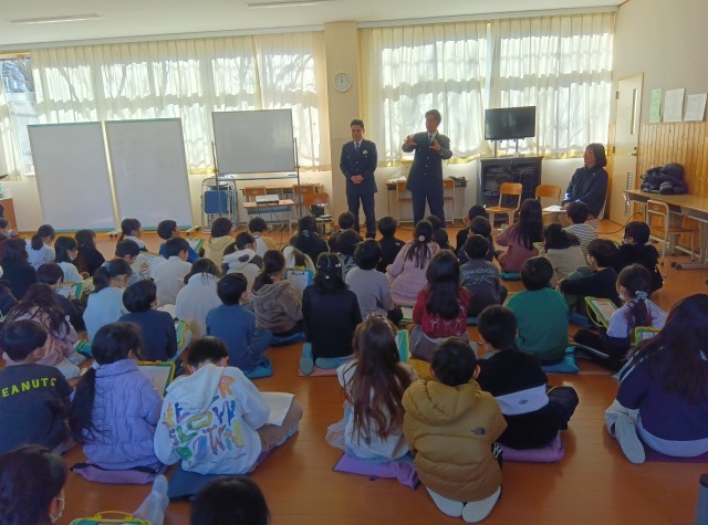 3年生は、町育といって町のよさを見つける学習に取り組んでいます。今日は、成城警察署の警察官、里山コア会議の方を講師にお招きし、町のためにどんなことをしているのか、町への思いをお話していただきました。
