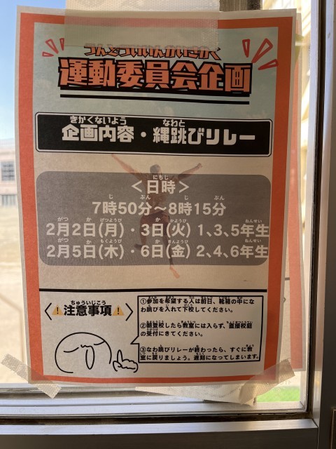 運動委員会のみなさんが、朝授業が始まる前に「縄跳びリレー」を企画してくれました。今回は、1、3、5年生が対象でした。運動委員会のみなさんのテキパキとした活躍で朝から運動ができました。