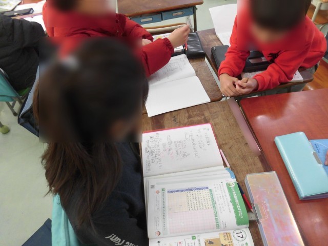 3年生の算数では「かけ算の筆算」の学習をしています。1桁×2桁、2桁×2桁、3桁×2桁のかけ算の筆算の仕方について理解して計算できるように取り組んでいます。今日は、筆算の方法について自分の考えをまとめ、グループで発表し合いました。自分とはちょっと違うやり方や、新しい発見もあり、それぞれのノートを見たり、発表を聞いて「そっかー!なるほど!」と言いながら理解を深めていきました。
