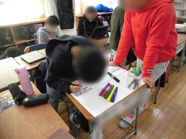 5年生の総合的な学習では、「共生社会」の学習を進めています。人種、国籍、民族、障がい、性別などのテーマ別にグループに分かれて、掘り下げて調べ学習を続けました。今日は、調べてきたことを模造紙にまとめ、発表する準備が始まりました。すべての人が互いに個性を認め、支え合うことができる社会を目指し、さらに理解を深めていきます。