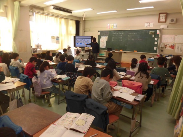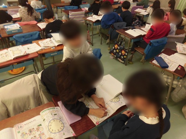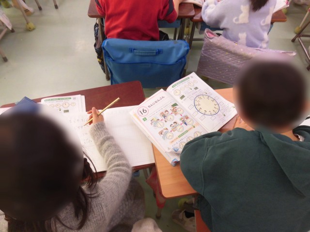 1年生の算数では「なんじ なんふん」の単元で時計の読み方の学習が始まりました。時計の短い針で「時」、長い針で「分」を読み、まわりの数字から時刻を読み取る方法を学びました。教科書の問題を真剣に解き、友だちどうしで教え合う様子も見られました。数字表示のデジタル時計を利用することも多くなりましたが、短針と長針を読み取ることができるように学習を進めていきます。