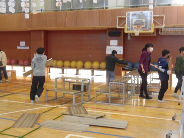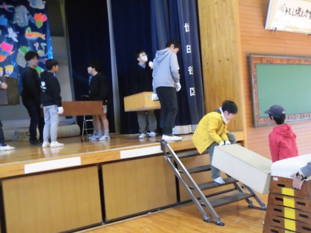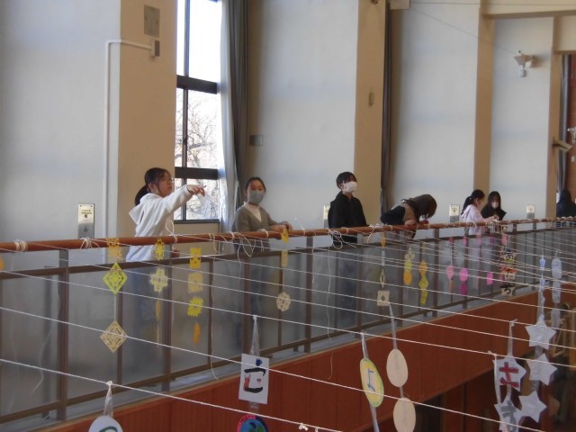 6時間目に6年生と職員で作品展の会場づくりを行いました。あらかじめ分けられたグループで集まり、割り振られた仕事に取りかかります。様々な場所から、台やパネルを運ぶので、危なくないように担当の職員がしっかり見守ります。「重いから手伝って!」「階段だからゆっくり行こう。」など声をかけあいながら、協力をする姿はさすが最高学年でした。手が空くと、まだ終わってないグループに積極的に合流し、みんなで早く仕事を進めようとする気持ちも感じられました。今日は作品を展示する台にきれいに布を飾り付けるところまで完成しました。学年ごとにカラーが違い、作品が並べられたときにどのようになるか期待が膨らみました。