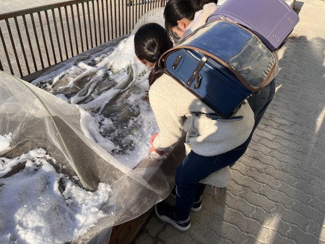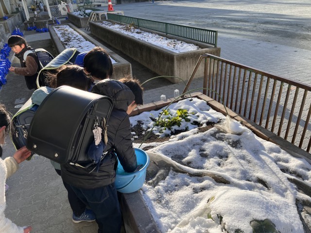 昨日は都内でも積雪がありました。今日は晴れていますが冷え込んでいます。雪を大人はあまり歓迎していませんが、子どもたちは楽しかったようです。「雪だるまを作った!」「氷が張ってます」とたくさん報告をしてくれました。昇降口付近の凍ってしまっている所を教職員で取り除きましたが、まだ凍っている所があります。道にも凍っている所があるかもしれません。転ばないよう注意するようご家庭でもご指導ください。