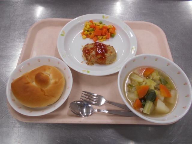 【献立】 牛乳 ミルクパン アップルチーズハンバーグ 3色野菜のグラッセ 野菜スープ