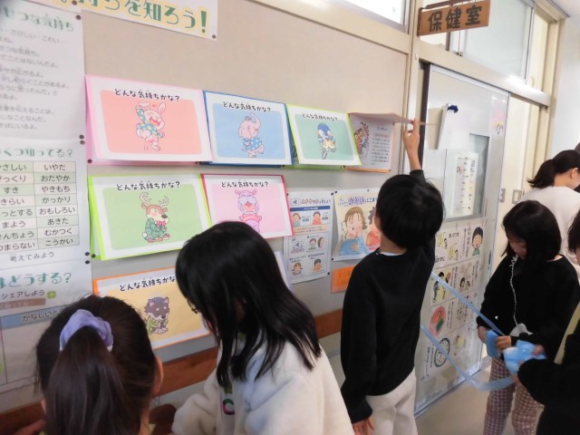 保健室の掲示板には、「いろいろな気持ちを知ろう」「咳エチケットについて考えよう」というテーマの掲示がされています。動物の絵をめくるとどんな気持ちかが書いてあったり、自分がうれしい時、悲しい時にはどんな行動をするのかを付箋に書いたりできるようになっています。咳エチケットについての絵についているウイルスの札を引くと、長くひもが伸び、どのくらいまでウイルスが飛んでいくのかを実際に確かめることができます。休み時間には早速子どもたちが集まり、しかけを楽しんでいました。特にウイルスがついたひもは、廊下を超えて向かい側の教室の中まで伸びたので驚いていました。相手の気持ちを考えることや、咳をするときにウイルスを飛び散らせないようにすることは、どちらもまわりへの配慮を必要とします。遊びを通じてそのことに気づいてくれるといいなと思いました。