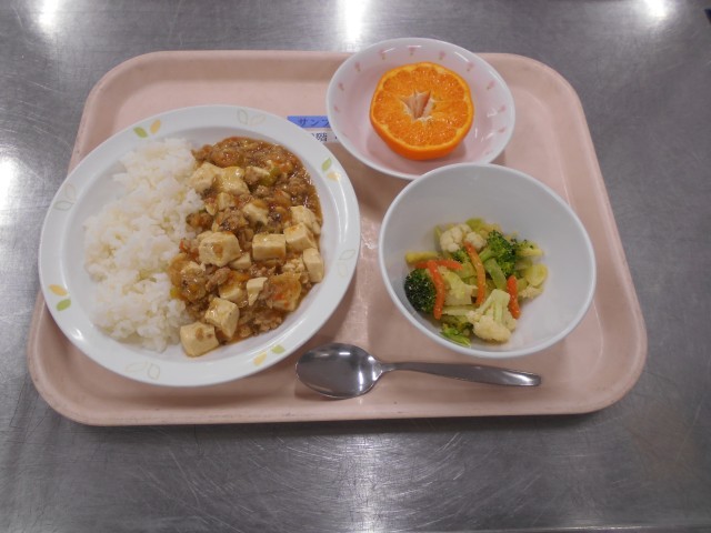 【献立】 牛乳 麻婆豆腐丼 花野菜の中華あえ くだもの(はるみ)