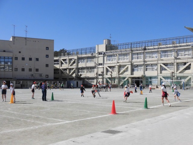5年生の体育では「フラッグフットボール」の学習が始まりました。フラッグフットボールは、アメリカンフットボールに似ていますが、タックルをせず、代わりに腰につけた「フラッグ」を取ることでプレーを止めます。ルールを理解し、動きや守りをかわす方法をしっかりと学習して、チームに分かれてゲームを行いました。チームで作戦をたてて、ボールをパスしたり走ったり、楽しみながら学習できました。