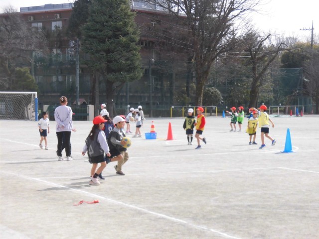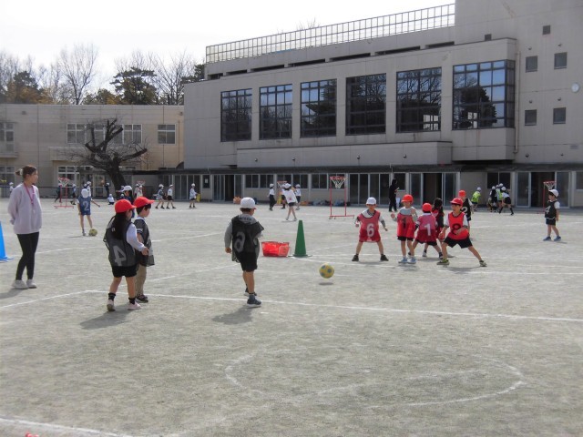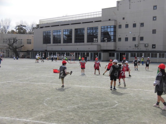 1年生の体育では「ボール蹴り」の学習をしています。まっすぐに的をめがけて蹴ったり、強く蹴るにはどうしたらよいか考えながら練習しました。上手に蹴るコツをつかみ、「できた!」と喜ぶ様子もみられました。チームに分かれてボール蹴りゲームも行い、相手に取られないように、助走つけて、強いボールを蹴ることができました。「がんばれー!!」と仲間を応援して、上手くできるとみんなで喜び、楽しくゲームすることができました。