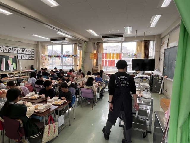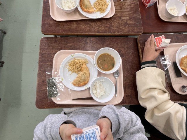 今日の給食は、MEISEIランチ委員会の皆さんが企画してくれたメニューでした。つけ麺にライス、トッピングの海苔と大人気のジャンボ餃子です。朝から「今日の給食、楽しみ!』と言う声がたくさん聞こえました。