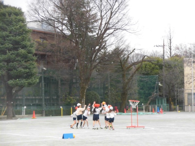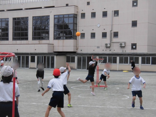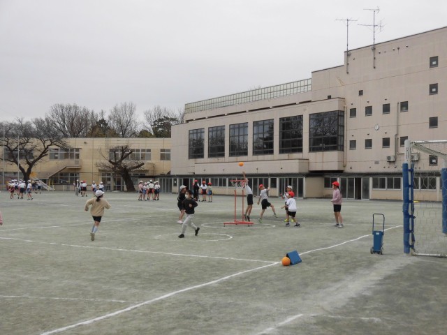 3年生の体育では「セストボール」の学習が進んでいます。練習を積み重ね、チームで作戦をしっかりとたてて試合に臨んでいます。パスを上手につなげてシュートをねらいます。「もう少し後ろ!」「こっち!」「パス!」など、チームで声をかけ合っている様子が見られました。得点が入ると、チームみんなで喜んでいました。しっかりと体を動かし、体もポカポカになったようです。