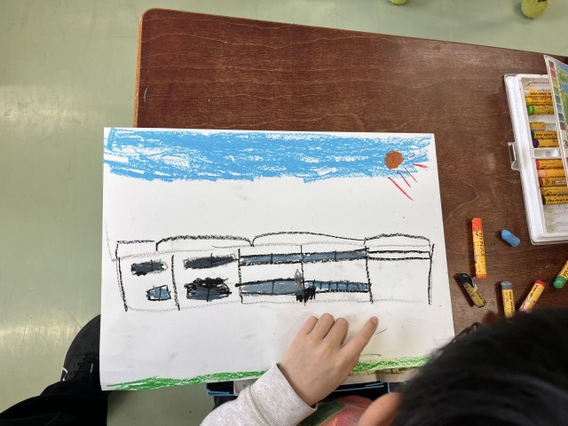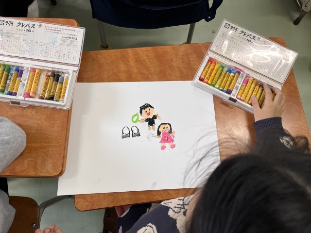 もうすぐ1年間の学習が終わり、新しい学年や学校に進級・進学します。1年生は1年間を振り返り、いろいろな出来事を絵に描きました。完成した絵は、新1年生の教室に掲示する予定です。