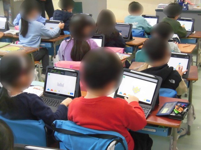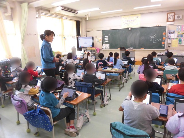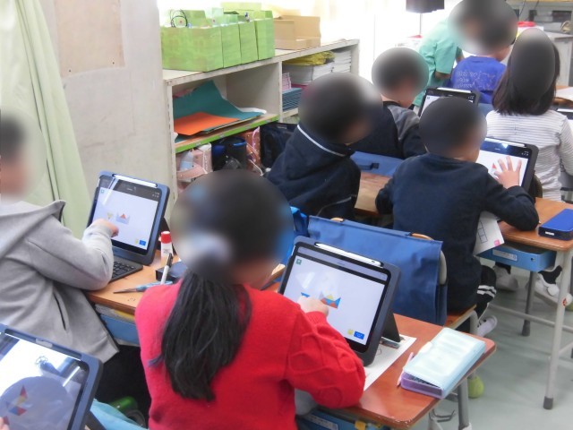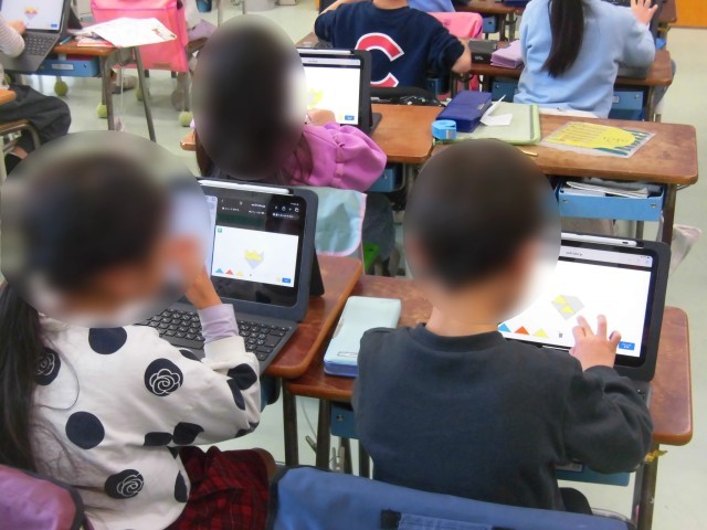 1年生の算数では「かたちづくり」の学習をしています。三角形の色板をずらしたり、回したりして、さまざまな形を作ります。タブレットも活用して、いろいろな形を作りました。見本となる形を見て、三角形を組み合わせて同じ形を作ることができました。「こっちかな?!」と試行錯誤しながら、三角形の色板の位置や向きを変えて考えました。組み合わせ方を変えると形が変わることに気づき、自分で考えて形も作ることができました。