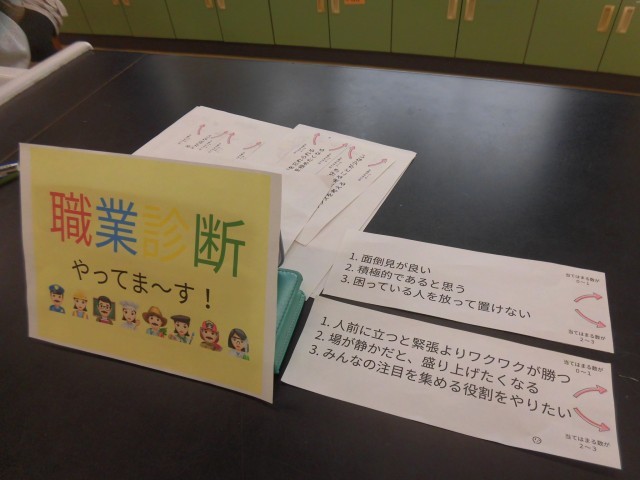 6年生は総合学習で、様々な職業について調べました。今日その調査の結果を活かして、ワークショップを開催しました。設置したブースでは、ゲームなどを通じて体験ができます。2時間目には4年生のクラスが訪れました。美容系の仕事をテーマにしたブースでは、新聞紙を髪の毛に見立て掃除をする体験ができます。アンケートに答えながら職業診断をしてくれるブースや手作りの人生ゲームで職業を紹介するブースもありました。家庭科室いっぱいに作った迷路ではスタンプラリー方式で進み、ゴールした人には折り紙で作った景品が渡されていました。今回興味を持って調べたことが、将来職業を選ぶときに思い出されるかもしれません。