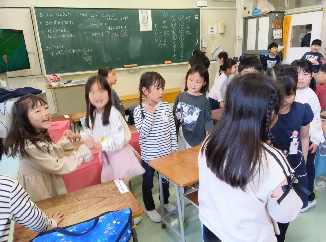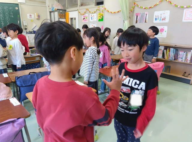 音楽が鳴っている間は歩きます。音楽が止まったら、出会った友達と「〇〇です。よろしくね。」とハイタッチをします。
