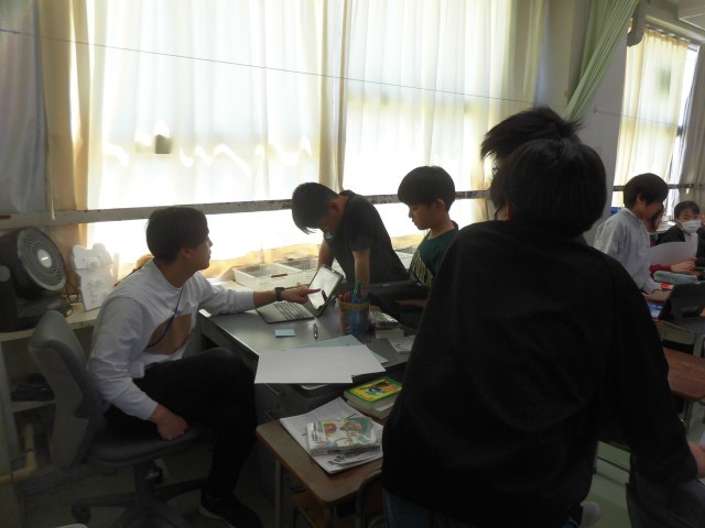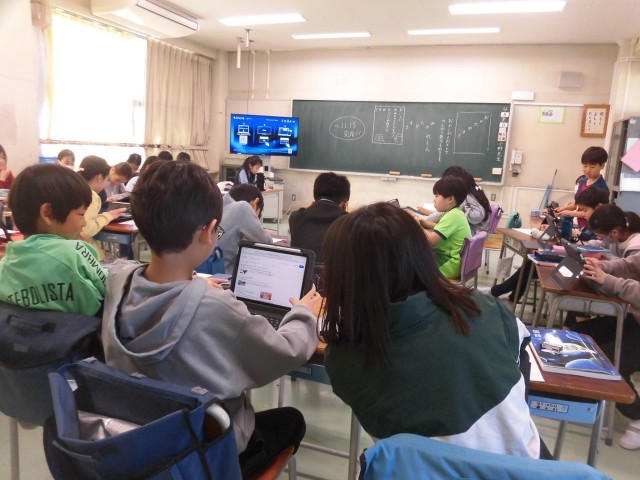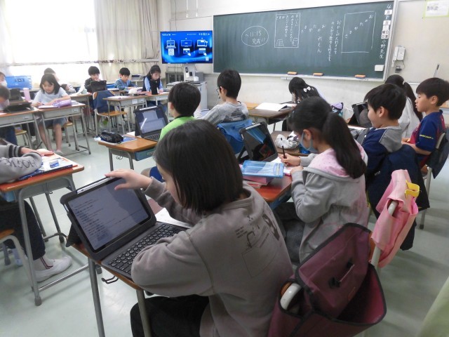 5年生の国語では「名前を使って、自己紹介」の学習をしています。「あいうえお作文」で自分を紹介する文章を書きます。文章の初めは自分の名前の文字になるように短い文章を考えます。タブレットも活用して、一生懸命に考える様子が見られました。自分の好きな食べ物やスポーツ、得意なことなどの文章を作りました。先生に相談し、アドバイスももらいながら、すてきな自己紹介になりました。とても楽しく学習できました。