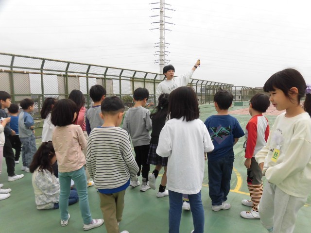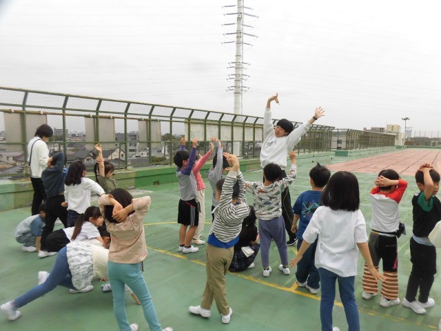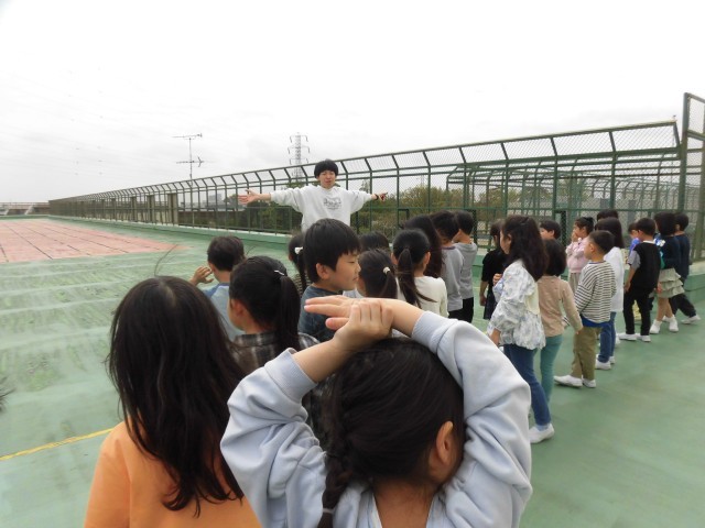 1年生の生活科の活動で学校探検をしています。今日は、初めて屋上を探検しました。「わぁ、広いな~」「気持ちいい!」「すごい高いよ~」「ぼくの家が見えそう!」と言いながら、広い屋上にびっくりする様子が見られました。広い空と気持ちの良い風を感じながら、みんなで大きく伸びをして、深呼吸しました。