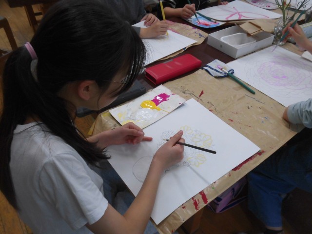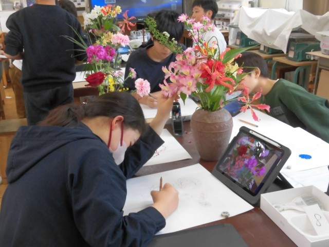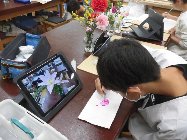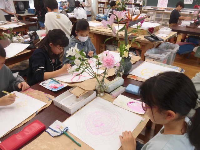 6年生の図工では「メガフラワー」の作品を制作しています。花瓶にいけた実物の花をじっくりみながら、大きな白い画用紙に、自分の感じたままに描きます。どの花を描くか決めて、鉛筆で下書きました。顔の近づけて、花の香りを感じながら観察したり、タブレットを活用し写真を撮り、細かいところまで観察しながらゆっくりと線を描いていきました。アクリル絵の具や水彩絵の具の特徴をとらえて、色をつけました。とてもきれいでカラフルな花がたくさん咲きそうです。