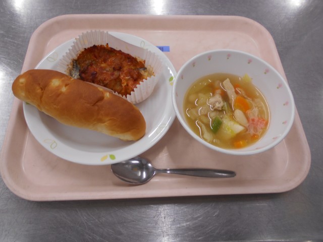 【献立】 牛乳 パインパン 白身魚のピザ風 白いんげんの田舎風スープ