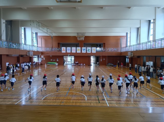 走った記録は、5年生が計測します。5年生は、ペアの2年生が誰なのかを確認し、応援しながら数えています。思わず一緒に走りながら計測している5年生もいます。体力テストでも、異学年交流をしています。