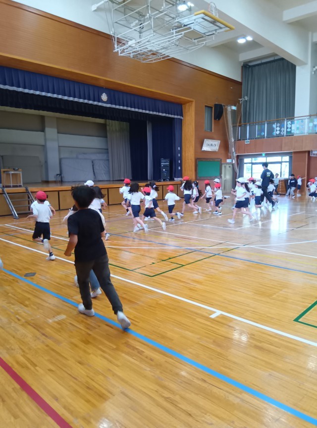 2年生は、体育館で体力テスト種目である、20mシャトルランをしています。2年生、よく手を振りながら頑張って走っています。