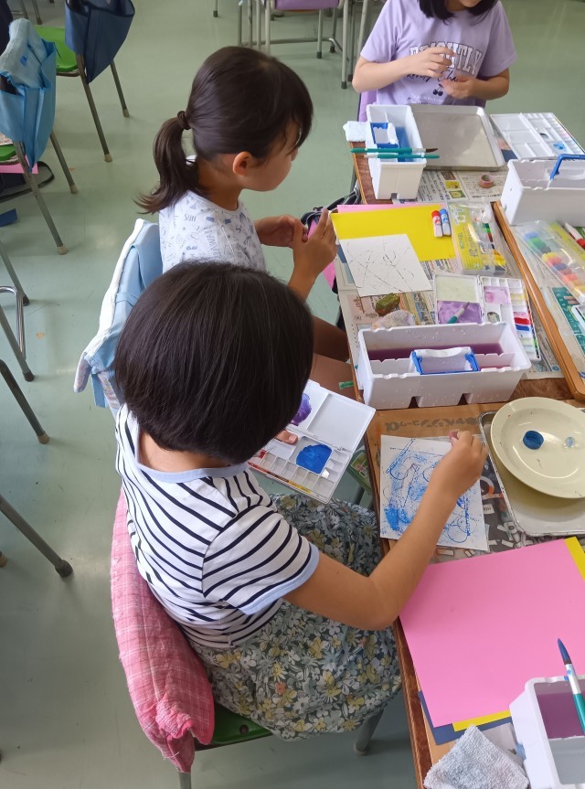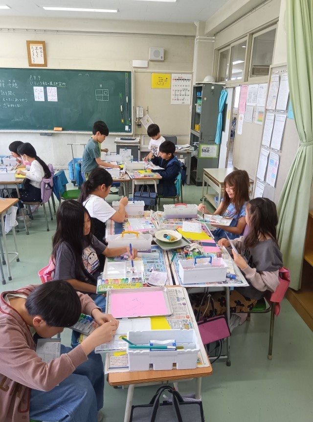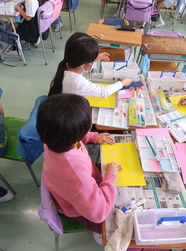 4年生は、図工の学習で、絵の具研究に励んでいます。