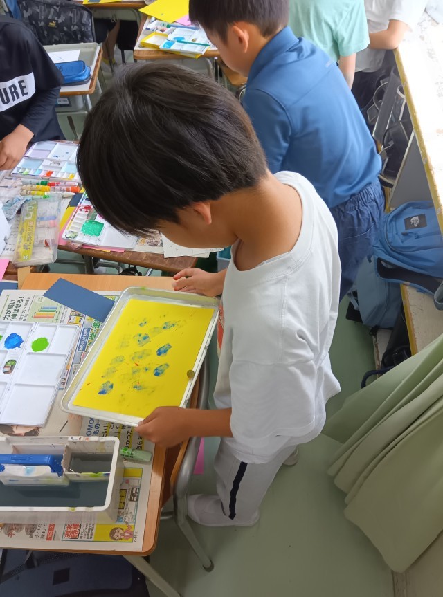 子どもたちは、絵の具を使い、複数の色を混ぜて変化を楽しんだり、筆だけでなく段ボールやペットボトルのふた、ビー玉などの道具を使ったりして表現しています。その中で新たな発見をし、友達と見せ合い、伝え合いながら学習を進めています。5分休みも、夢中になって取り組んでいる子どもも多いです。