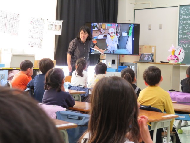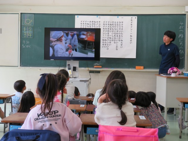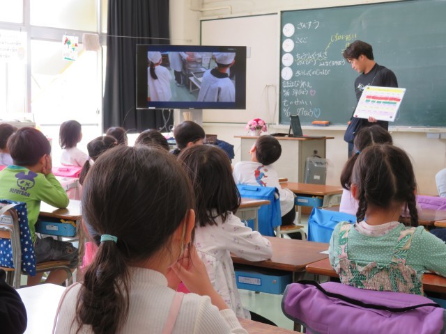 今日から、1年生の子どもたちが楽しみにしている給食がはじまりました。まずは動画を見て勉強をしました。