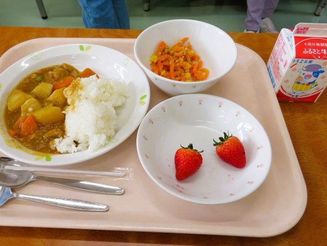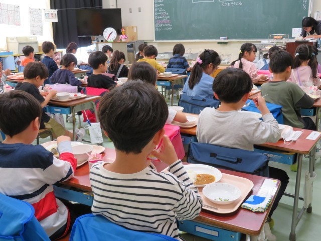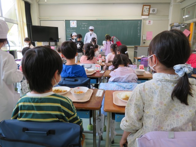 1年生はしばらくの間、先生と一緒に配膳をします。子どもたちは、「おいしい!、おいしい!」と言って食べていました!