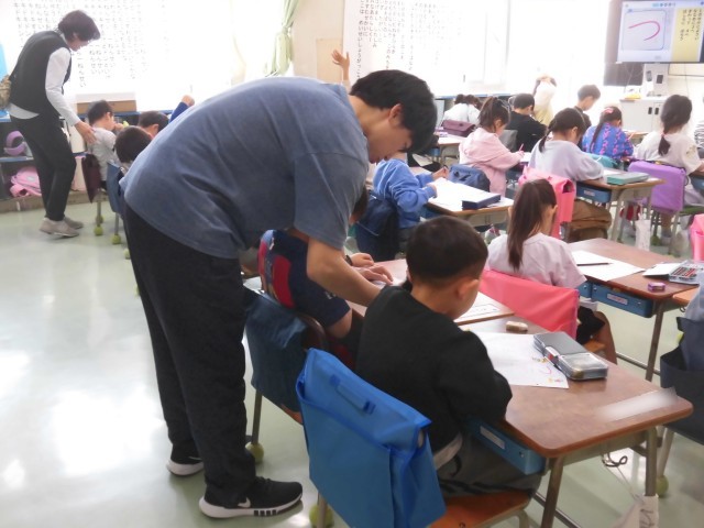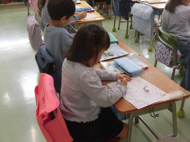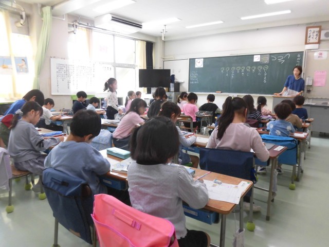 1年生の国語ではひらがなの学習が始まりました。今日は「つ」を練習しました。「つ」がつくものをみんなで考えて発表し、たくさんの言葉が黒板に並びました。ワークシートになぞり書きをして、「つ」の特徴をとらえて、何回か書いて練習をしました。先生にたくさんマルをもらい、もっと書きたい!と意欲的に取り組むことができました。