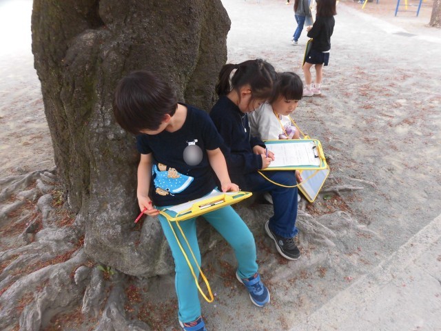 1年生が「校庭たんけん!春さがし」を行っています。「春さがしビンゴカード」を持って校庭を歩きながら、ピンク色の花、黄色の花、桜の花びらなどを探したり、木にさわってみたり、生き物をみつけました。次々と「春」を見つけて、あっという間にビンゴがそろっていました。「かわいいお花見つけたよ!」「ダンゴムシがいる!」「甘い匂いがする!」など発見した春をたくさん教えてくれました。校庭でたくさんの春の中から自分のお気に入りも見つけることができました。