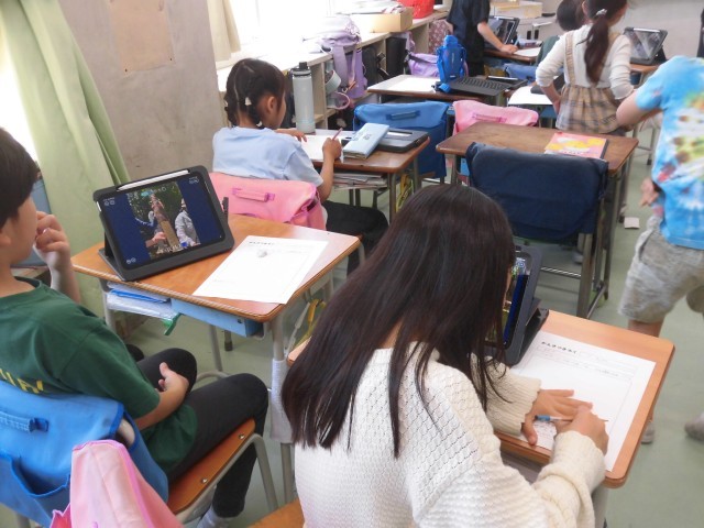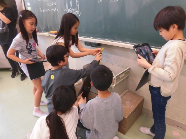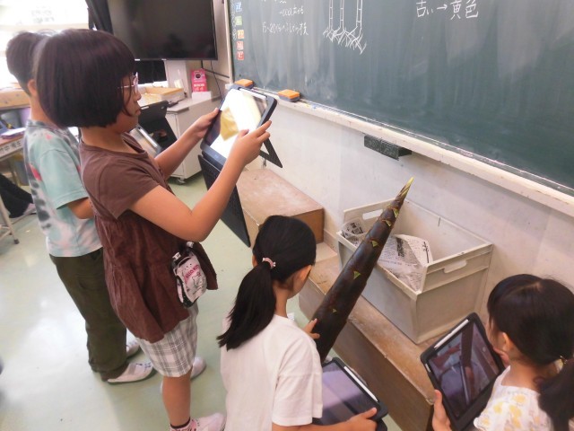 里山で育った95cmほどもある大きなたけのこをいただいて来て教室で観察しました。葉や皮の枚数を数えたり、色や大きさを調べて観察カードに記録しました。触ったり、においを嗅いで、じっくり観察しました。タブレットで写真を撮って、細かいところまで観察して、観察カードにたけのこの絵を描き、気づいたことを記入しました。記入欄だけでは足りず、カードの裏面も使って記録しました。