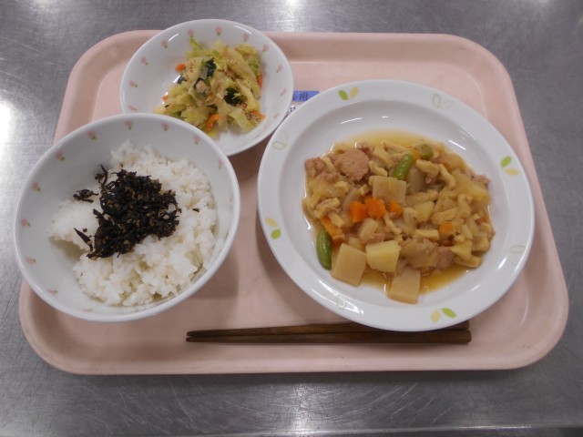 【献立】 牛乳 ごはん(有機米) しそひじきふりかけ 肉じゃがうま煮 和風ツナサラダ