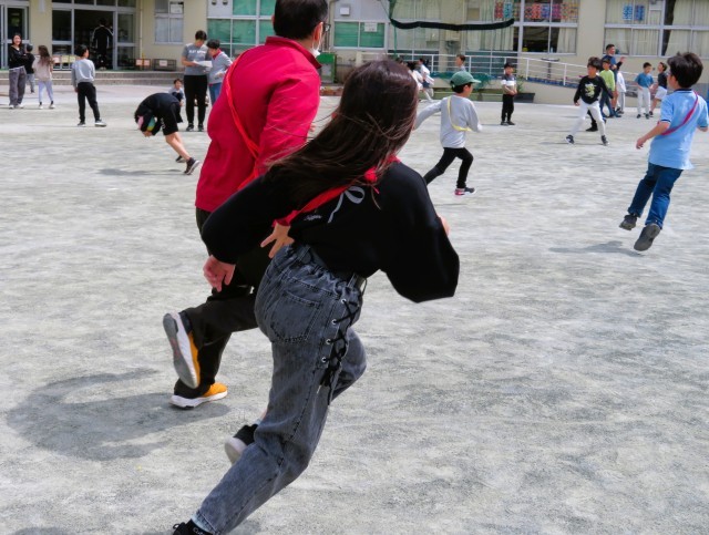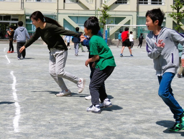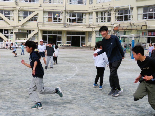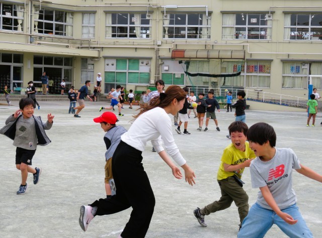 明正小学校は、休み時間に校庭いっぱいに広がって遊ぶ子どもたちの笑顔ではちきれそうです。中でも、子どもたちと一緒に先生たちも遊んでいると、いっそう笑顔が膨らみます!