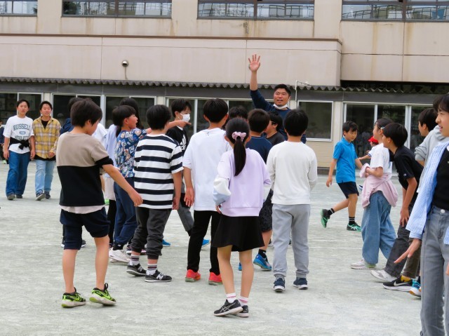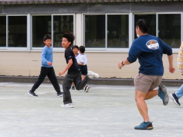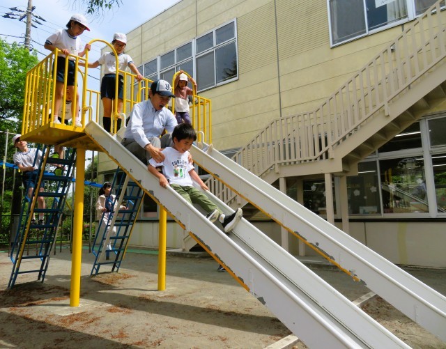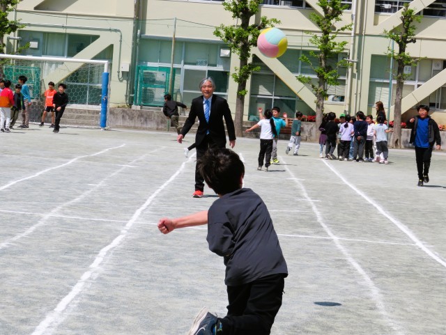 高学年まで多くの先生が遊んでいます。副校長先生はボール投げ、私(校長)はすべり台遊びです。
