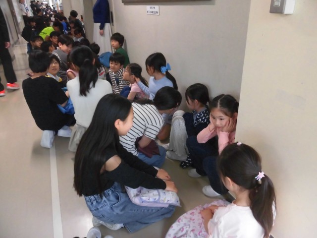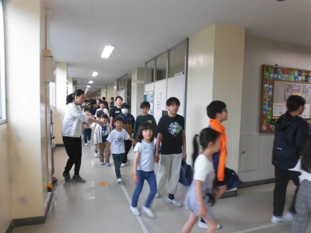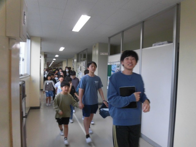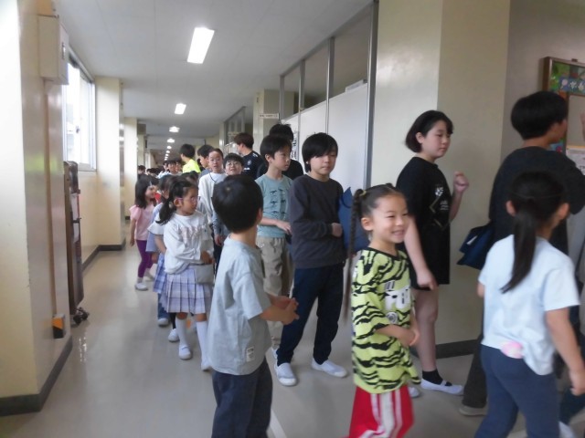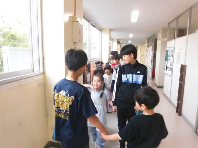 1年生を迎える会では、1年生は6年生と一緒に入場しました。教室から体育館まで移動する際も、しっかりと手をつないで歩きました。待機中は1年生と楽しくお話したり、手遊びしたり、じゃんけんしたり、微笑ましい様子がたくさん見られました。頼もしくて優しい6年生と一緒に、1年生にも笑顔があふれていました。