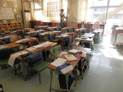 今日の避難訓練は地震発生時の想定です。緊急放送が入り副校長先生が「避難訓練、避難訓練、地震が発生しました。」という放送が入ると、教室いる子どもたちは一斉に机の下に入り安全を確保します。先週末に、東北地方で大きな地震があった事もあり、一人一人の真剣さが伝わってくる訓練でした。
